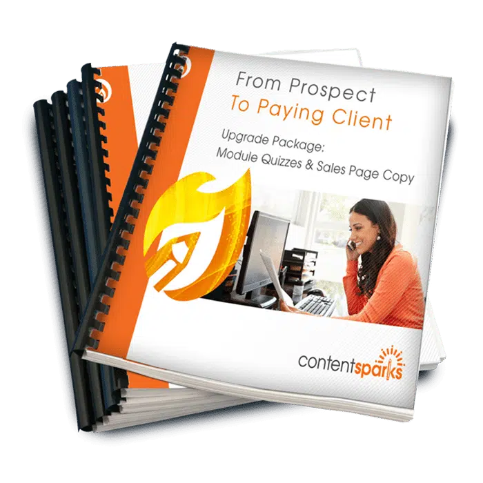 With this Upgrade Pack, you'll get content that complements our From Prospect to Paying Client course. These are terrific for getting more sales of your course, and to use as handouts, surprise gifts, bonuses, and more.
